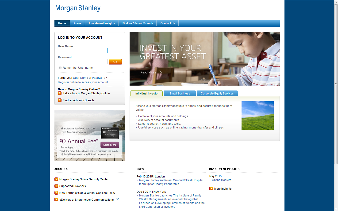 At Morgan Stanley, we understand that protecting your online personal and account information is an essential part of our commitment to helping you achieve your financial goals. Our fraud prevention teams use advanced technologies and industry-tested processes and procedures to provide multiple layers of defense to protect you against electronic fraud.