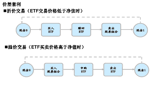 ETF上市之后,存在两个市场:一级市场和二级市场,即同一个标的物存在两个价格,套利者可利用两个价格在两个市场之间的差价进行低买高卖,从而达到无风险套利的目的。如下图所表示的两种情况: