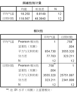平均气温和日照时间相关系数0.758,显著性水平为0.004,小于0.01,所以平均气温和日照时长相关系数为正向,且相关性很强。