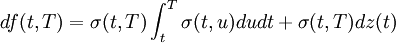 HJM(Heath-Jarrow-Morton)模型由赫斯(Heath)、加罗(Jarrow)和墨顿(Morton)在1992年提出,T 时刻瞬时远期利率f(t,T)的变化服从: