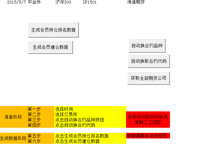 借助于99期货网站平台数据,利用excel中的vba编程使得在excel中直接下载该网站上的期货持仓数据。数据内容包括:国内所有期货上市品种日内持仓数据排名;国内各大期货公司对某一品种的持仓;操作方法见excel    操作界面如下图所示