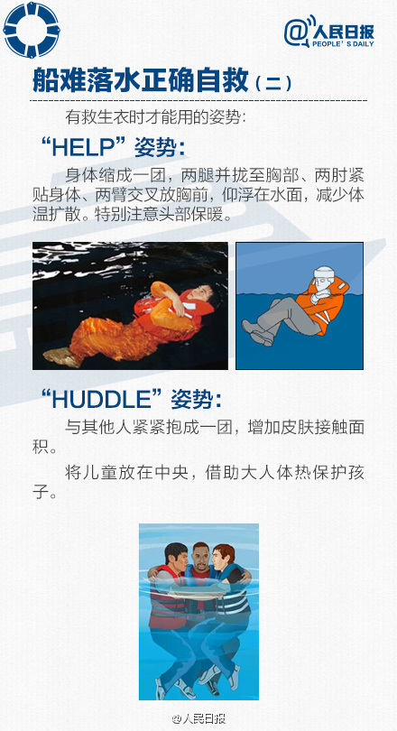 如遇沉船,如何自救?弃船落水,什么样的姿势有利生还?请参照图片学习。希望永远用不到,但一定要知道。