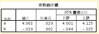 最终模型表达式y=EXP(4.063-0.039*x)