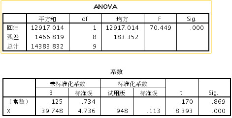 x系数是39.748,而且很显著,常数项是0.125,不够显著。