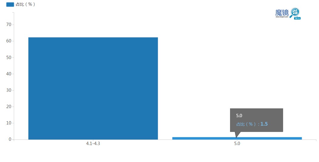 安卓手机升级率相对缓慢,4.1-4.3版本仍占据了半壁江山。