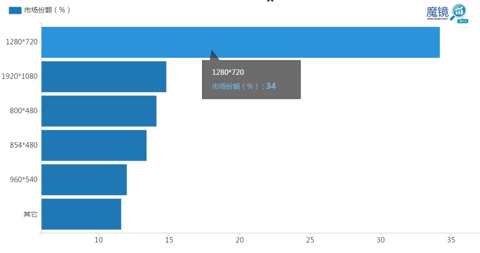 分辨率1280*720占领了超三分之一的市场份额。而分辨率1920*1080的机型已经蹿升至第二位,一定程度上说明了用户对高清像素的追求。