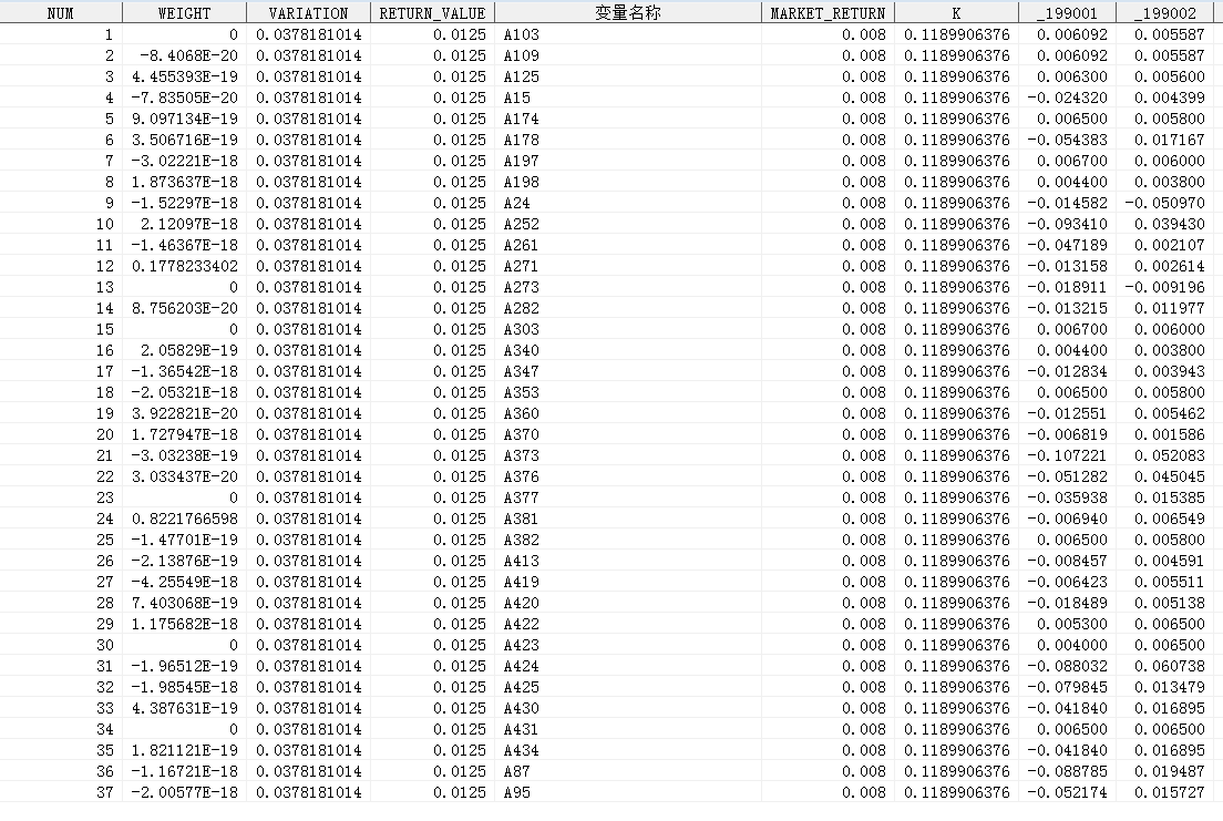 数据集格式如上,我想要用权重WEIGHT乘以后面的每个月的收益求组合的总收益,我写了一下程序但是不能运行,求出的r是缺省值。求高人解答。