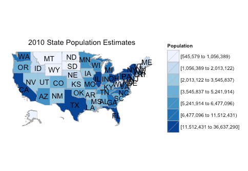 df_2010_demographics$value = df_2010_demographics$total_populationstate_choropleth(df_2010_demographics, title = “2010 State Population Estimates”, legend = “Population”)