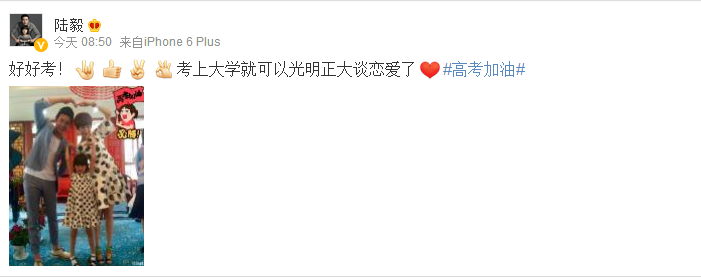 在这高考前的最后一天,我们来看看都有哪些明星朋友为高考考生加油祝福鼓劲呢?我从中搜了一些人的出来,像马苏、张嘉译、佟丽娅、景甜、胡彦斌、郑凯等人,还有我们的小美人李小璐,也发表情图为你们高考生加油喔,所以,你们就只需好好考,其他的等高考完之后再说……