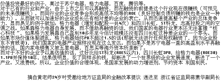 也就是说 四川长虹技术很落后,但依然保持高估值,可以有备用的弹药,继续浪费! 而格力电器 从ROE 来说不论是企业的科技含量还是经营管理都大幅超越四川长虹,但是由于估值不高,无法再融资来加入行业的竞争。然后就是让全中国都等待格力靠自身的发展来提高中国的室内制冷行业!(而室内制冷行业影响了每个人的工作效率,心情不好工作不畅,那么是不是各行各业都受影响呢!)。如果靠他自身发展(盈利再投资)中国需要等上50年,而如果高估值环境可以让他再融资去抢占市场那么这个过程只需要20年!就像你不融资给腾讯和阿里巴巴一样,那么中国各行各业都是如此的花,你显而易见的会发现中国会落后至极。