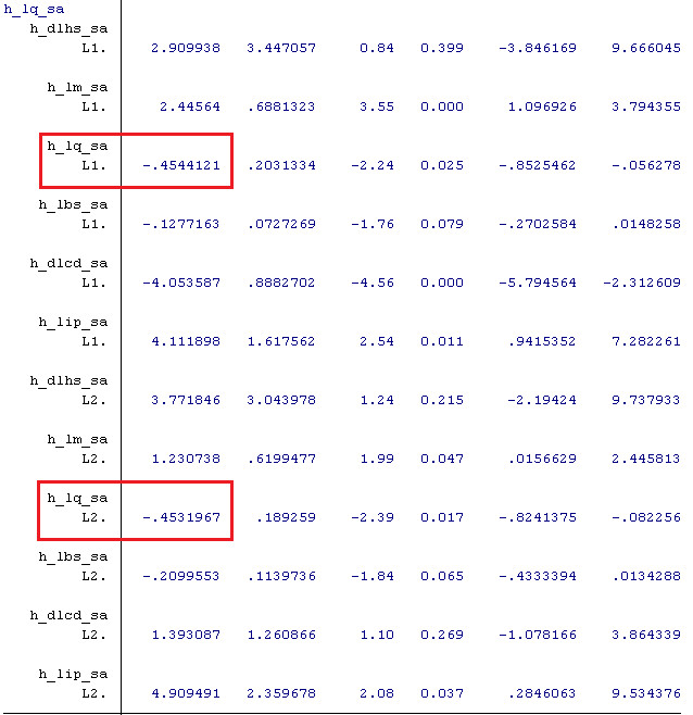 crystal8832 发表于 2015-6-10 16:04 首先,您使用Stata做的,应该在Stata版块更适合 另外,VAR作为非结构化的模型,一般我们很少关注参数估计结 ...