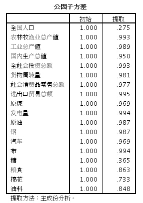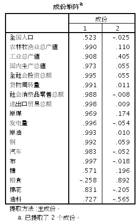各个主成分在各个变量上的载荷,从而可以得出各主成分的表达式,表达式中各个变量已经不是原始变量而是标准变量。具体表达式略。在第一主成分中,除两市以外的变量的系数比较大,可以看成是反映那些变量方面的综合指标,在第二主成分中,变量粮食的系数比较大,可以看做是反映粮食的综合指标。但是主成分分析只是一种矩阵变换,所以各个主成分并不一定具有实际意义。