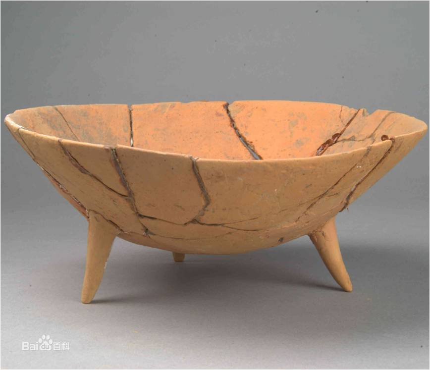 图2-4 裴李岗文化红陶三足钵,这种鼎形结构主要作用是因园底形陶器不稳定,需要支撑。