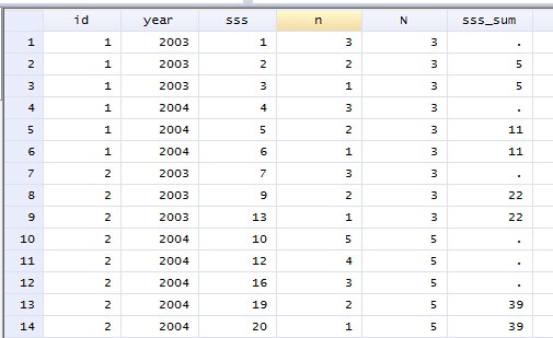 余杨 发表于 2015-6-15 20:21 如图所示,其中n是按照同一id同一年份按照sss大小进行的排序,sss_sum是排序前2位的sss值相加,现在我想把s ...