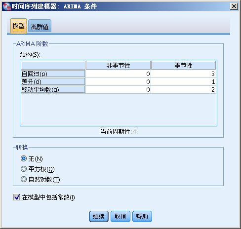 AR自回归部分的三项显著性水平分别为0.549,.0,00和0.033,而MA移动平均部分的两项显著性水平0.607和0.160.因此ARIMA(3,1,2)比较合适。