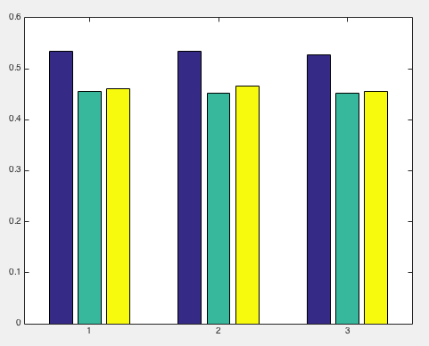 但仔细看的话,可以看到因素1的水平二和三(图中绿色和黄色的bar)在因素2的不同水平下表现是不一样的: 因素2的水平二时黄>绿(pairted ttest p<0.0005, t(33)=4.32),其他两种情况下黄vs.绿没有显著区别。这一交互效应在上述3 x 3分析中并未体现出来,而如果因素1只取绿、黄两个水平和因素2一起做2 x 3的方差分析的话,交互项是显著的(F(2,66)=3.98, p=0.02)。