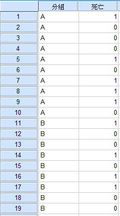 我有一张表,有两组数据(A和B),统计其死亡率,0代表死亡,1代表存活,怎么用SPSS进行卡方检验?