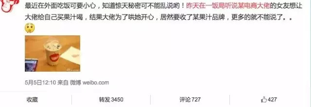 AngelaBaby还不是投资HeyJuice的第一个女星,上个月就有知名博主爆料,“昨天在一饭局听说某电商大佬的女友想让大佬给自己买果汁喝,结果大佬为了哄她开心,居然要收了某果汁品牌”,暗指京东投资HeyJuice是奶茶妹妹主导。