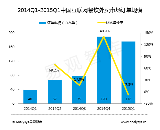 根据Analysys易观智库数据显示,由于在线外卖用户以学生和白领为主,受春节假期影响,第一季度订单量环比下跌7.5%,但同比上升340.8%,季度复合增长率高达45%,显示了强劲的增长惯性。