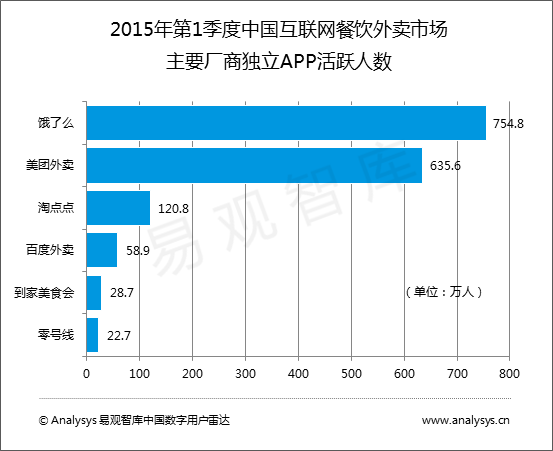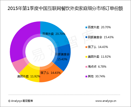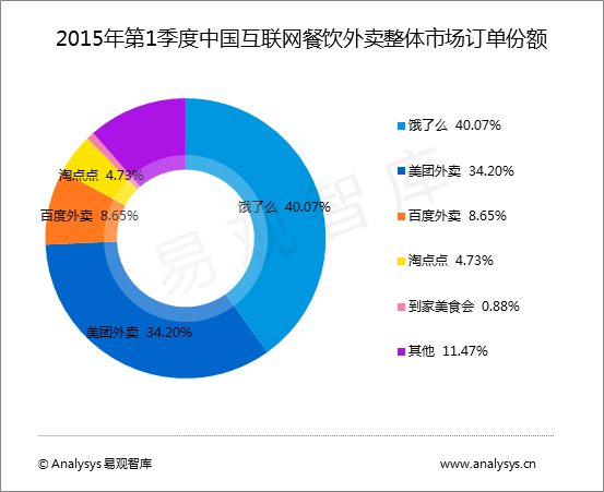 6月16日,易观智库发布《2015年第一季度中国互联网餐饮外卖市场报告》,报告显示,今年第一季度,在线外卖成交订单高达1.76亿单,同比增长340.8%,增速惊人。前两名的饿了么和美团外卖合计占超过七成市场份额,其中饿了么整体份额占比突破40%,校园和白领细分市场占有率均居首位,美团以34.20%的整体份额排第二,双寡头之间差距拉大。