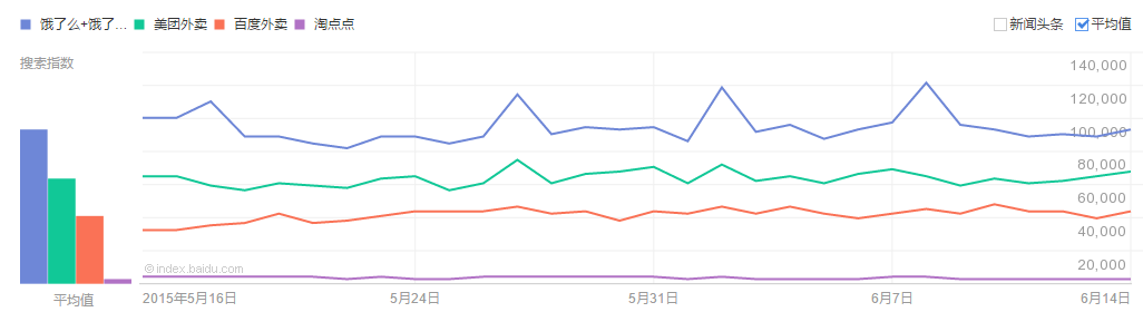 从近30天百度指数看,四家平台之间差距同样明显,饿了么相关关键词以96690的整体搜索指数领先,美团外卖、百度外卖和淘点点分别为64200、44362和4090。