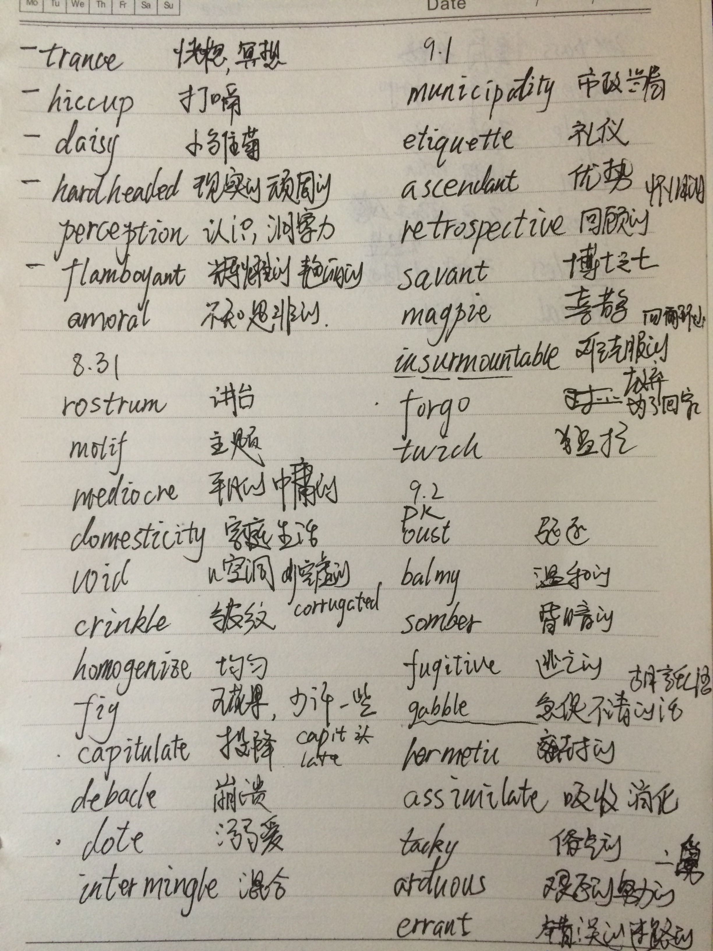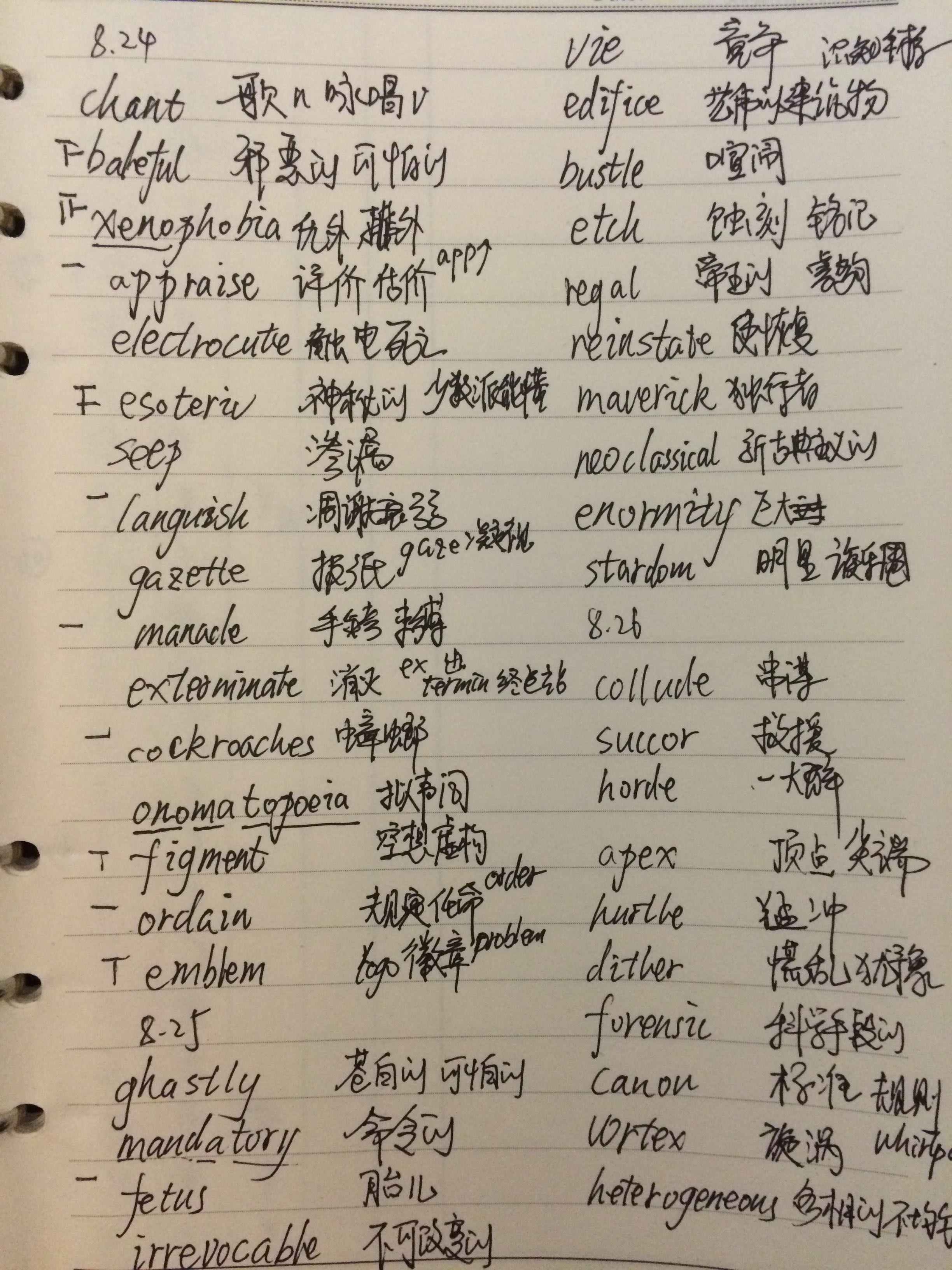 8.24:斩62。速记几个词:gazette报纸,gaze凝视,t头t条,值得凝视的头条,报纸。exterminate灭亡,ex出,terminate终点站,出终点站,灭亡。appraise评价,app,raise排名提升,需要好的评价
