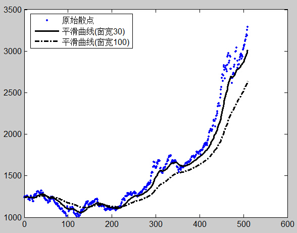 >> legend('原始散点','平滑曲线(窗宽30)','平滑曲线(窗宽100)','location','northwest');
