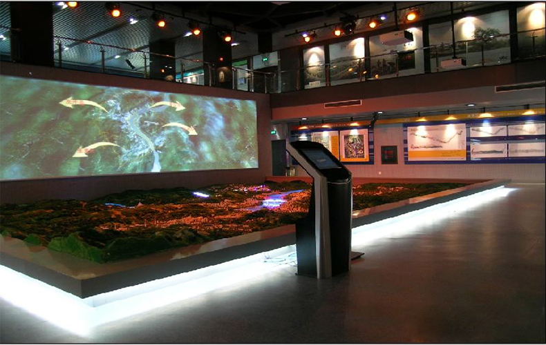 三维数字沙盘一般由多媒体展示系统、灯光调控系统、实体模型、中央控制系统、触摸屏一体机等组成。在实体沙盘模型上,利用动画及多媒体软件演示,通过投影的方式,将动态效果投射到实体沙盘模型上,结合灯光音效及配音讲解,生动直观地进行展示,从而让参观者形象生动地获取简明、优美、逼真的动态信息。它能使观众对展示对象有全面、立体、直观的整体理解,比传统沙盘更具震撼力和感染力。