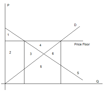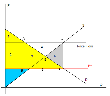 消费剩余是需求曲线与价格线和纵坐标围成的三角线即图中的1这一区域.生产剩余是由生产曲线与价格线和纵坐标围成的三角形,即图中的区域中的2+3+4(在其生产的产量全部销售出去的情况下),一般是对农产品施行最低限价,导致价格高于均衡价格(即需求曲线与供给曲线的交点),需求将小于供给,上图中的超额生产两条垂直线与横坐标的交点之间的线段,一般政府都会对超额生产部分进行收购,即超额收购,其中政府的成本为价格乘以这一段产量,即图中的(3+4+5+6)部分,最后综合无谓损失为(1+2-5-6),这个到底是损失还是最终净收益要进行比较的,从图中是看不出来的,如果有数字的话就可以进行定量分析啦