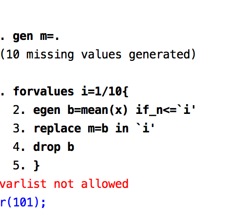 andystata 发表于 2015-7-4 16:12 在你的启示下,我是这样写的 gen m=. forvalues i=1/10000000{