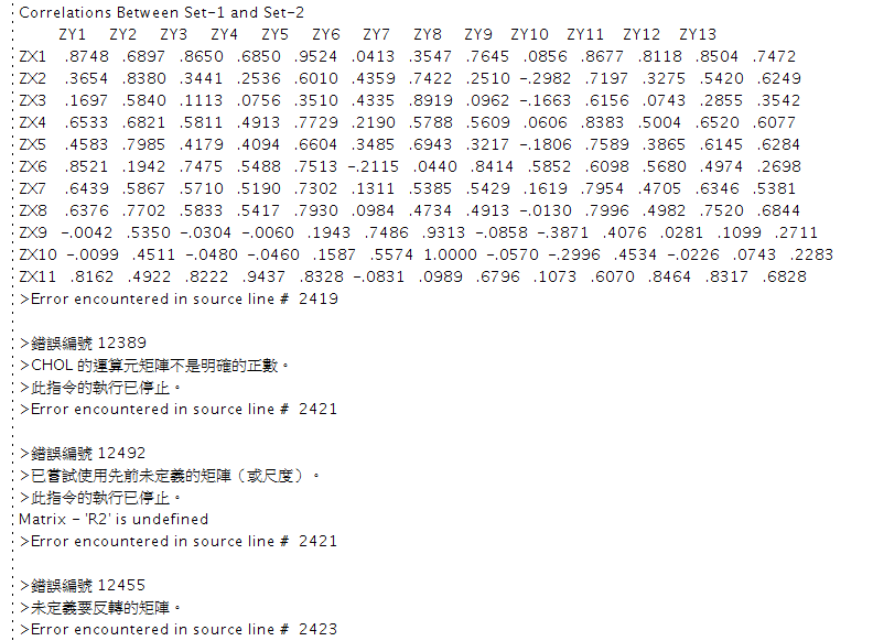 我用SPSS22.0按照网上的语句做典型相关分析,没有得出典型相关分析结果,只有相关系数。请问是版本的问题,还是我语句有问题呢。典型相关分析的数据我之前用SPSS做了标准化处理。麻烦各位大神解答~谢谢!我写的与语句是INCLUDE 'C:\Program Files\IBM\SPSS\Statistics\22\Samples\English\Canonical correlation.sps'.Cancorr set1=ZX1 ZX2 ZX3 ZX4 ZX5 ZX6 ZX7 ZX8 ZX9 ZX10 ZX11