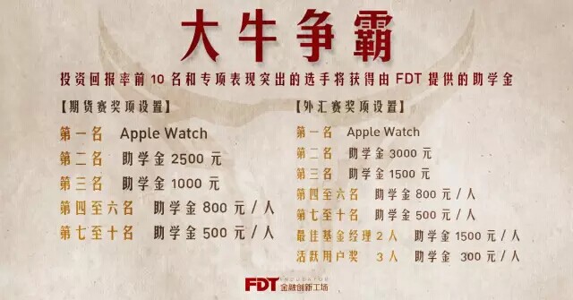 18000元总奖金的“FDT外汇暑期全国赛”,12000元总奖金的“FDT股指期货暑期全国赛”将在2015年7月6日同时拉开战幕,届时更有Apple Watch、现金红包任性派发!