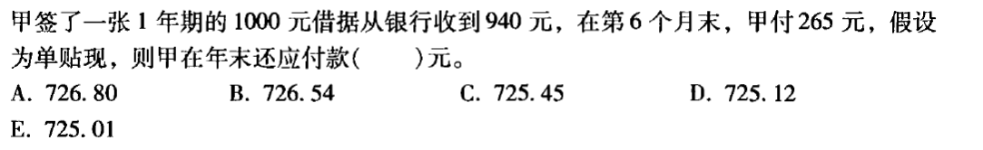 答案应该选A,单贴现即为单利,设每半年为一期,那么1000-940=60,这是两期(也就是一年)的利息,一期的利息就是60/2=30文,单利利率=一期利息/本金,即r=30/940=0.3191489,根据该利率即可折现,年中付掉的265文钱折现到年初是256.804125,也就是说在还了这些钱以后,即相当于在年初只借了940-256.804125=683.195875文钱,然后根据单利特点把683.195875折算到年末,即得到726.804124约等于答案A
