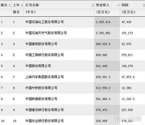 从营业收入排行来看,中石油、中石化2万亿元以上的收入(分别为2.8亿元和2.2亿元)使其它公司只能望其项背,第三名的中国建筑则为8千亿元。第四到第十名依次为中国工商银行、中移动、上海汽车、中国中铁、中国铁建、中国建设银行和中国农业银行。
