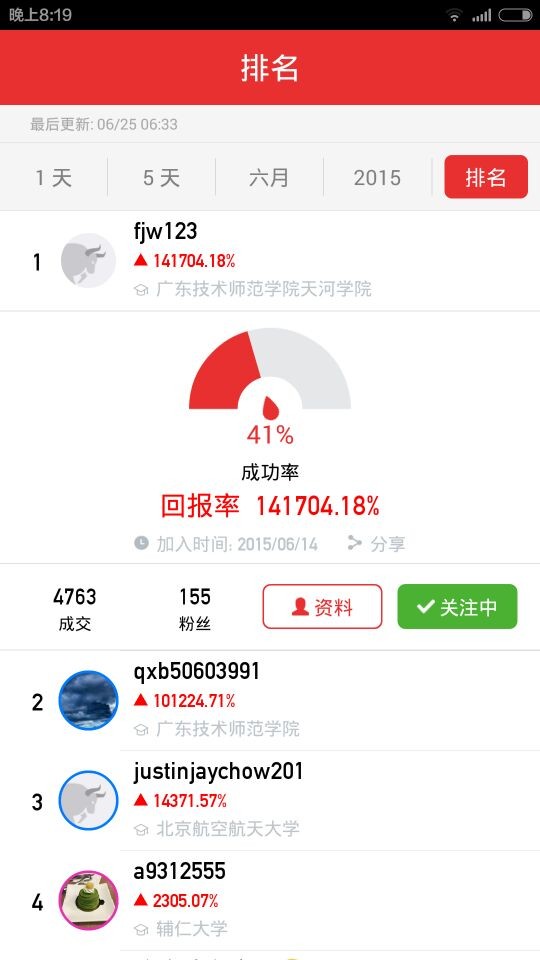 -- 以比赛期间参赛选手的投资回报率ROI由高到低计算成绩;若ROI成绩相同,以加入比赛先后时间排序。