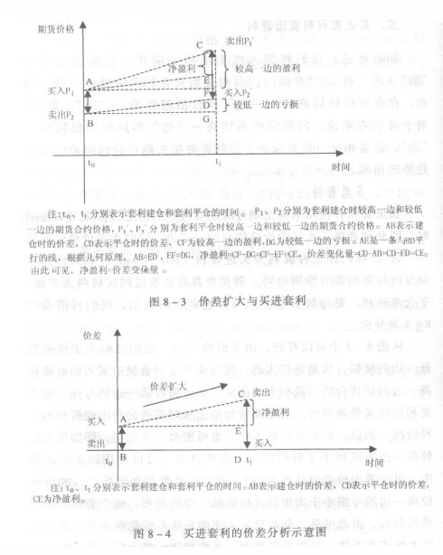 如果套利者预期不同交割月的期货合约的价差将扩大时,则套利者将买入其中价格较高的一“边”,同时卖出价格较低的一“边”,我们称这种套利为买进套利(Buy Sperad)。例如,如果套利者以450美元/盎司卖出8月份黄金期货,同时以461美元/盎司买入12月份黄金期货,这种套利就是买进套利。如果价差变动方向与套利者的预期相同,则套利者就会通过同时将两条“腿“平仓来获利。要理解价差扩大与买进套利的关系,我们可借助图8—3来分析。