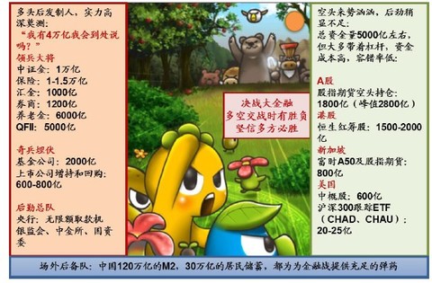 为什么决战的核心是大金融大蓝筹?因为此处是空方力量最薄弱地带,多方筹码集中,是多方战力最容易突破区域,别忘了央行无限的流动性供给,同时大金融大蓝筹对于指数贡献大,有利于拉动整个战局的多方人气,毕竟大部分投资者关注战局还是主要看上证指数指代大盘,因此稳住大金融大蓝筹可以使得观望投资者对市场恢复信心。空方实力最强还是在操纵型,炒作型股票(不是指创业板,而是纯讲故事,没估值,筹码集中在操纵者手里的股票),可以翻手为云覆手为雨,反正筹码在手,走势我有。不过我们还是认为空方的主要下注方向还是指数下跌,毕竟期指的空单也不是吃素的。
