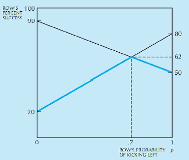 图 29.2:R 的策略。两条曲线表明,R 的期望收益是 p 的函数,其中 p 为他踢向左方的概率。不管 R 选择怎样的 p 值,C 都会极力使得 R 的收益最小(所以把下面的线段用蓝色表示,表示守门员做出的使罚进概率最小的选择)