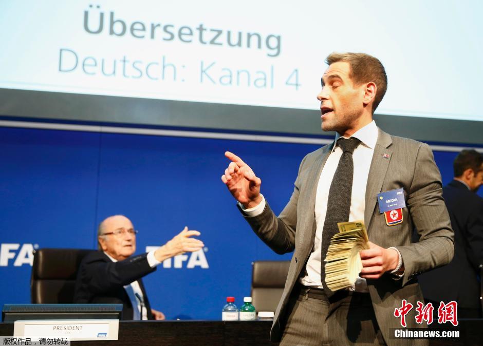 布拉特FIFA发布会现场遭钞票袭击