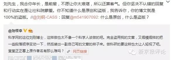 10日下午,刘钢在自己实名认证的微博上承认抄袭,并将自己博文题目前加上转载二字。而后,就在网友纷纷指责刘钢抄袭时,刘钢居然在微博回应称自己的脸就是厚、人至贱则无敌是真理……让众网友陷入一片惊叹中。尽管他随后将相关微博悉数删除,但相关微博截图仍在网络上流传。