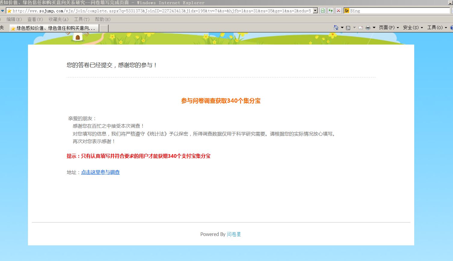 1.请点击http://www.sojump.com/jq/5331373.aspx进入问卷(方法是选中网址,右击,转到http://www.sojump.com/jq/5331373.aspx即可打开问卷)