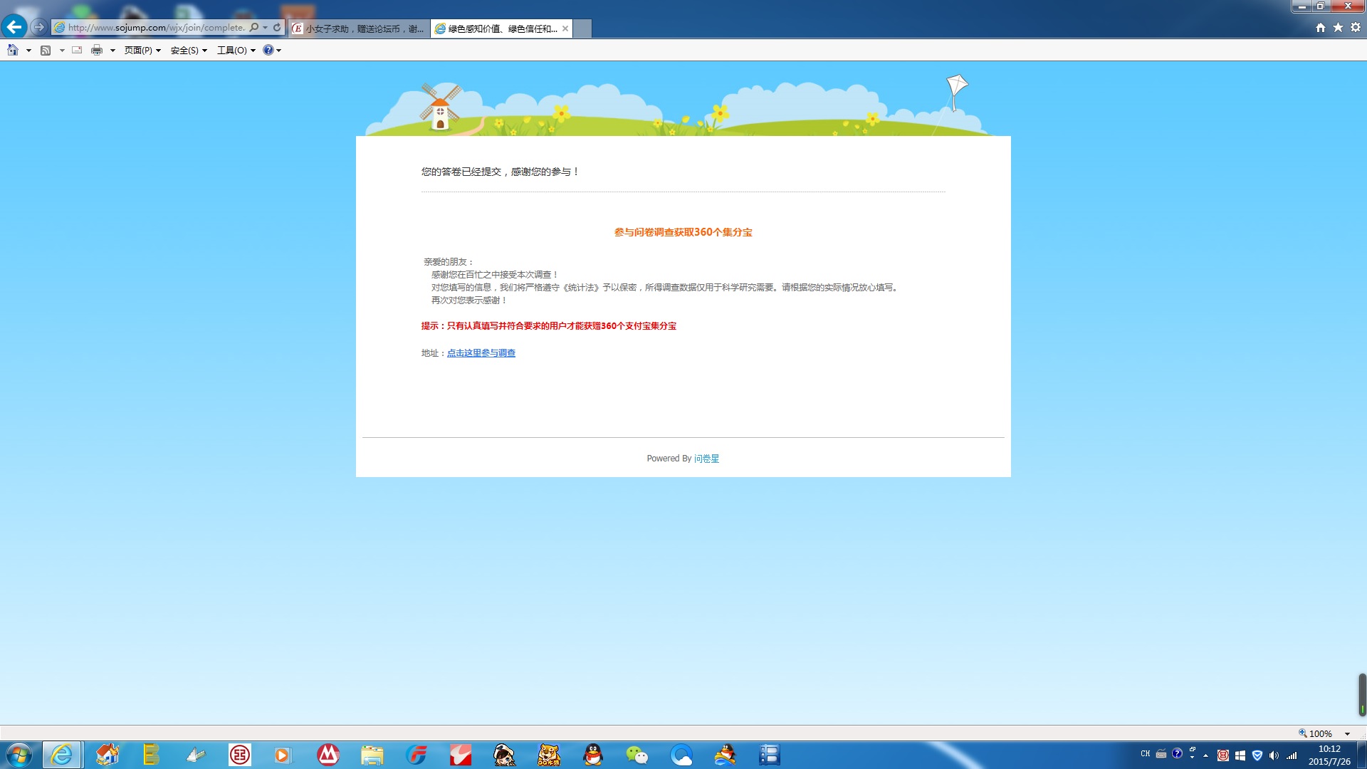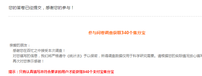 梵天净土 发表于 2015-7-25 22:30 只截你做完的最后一个画面,证明你做完了调查。问卷结果是 问卷星系统本身 发给发起者的。