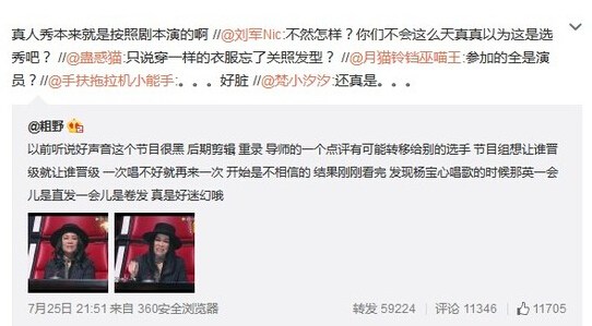 对此,一直为娱乐圈操碎了心的国民老公王思聪也来发泄一把。王思聪在微博里转发了粗野的微博并称真人秀本来就是按照剧本演的啊。王思聪转发评论之后,网友也来纷纷留言:”“纪检委你又终于来了 !”“老公说啥大实话呢 ?”“不是所有人都像老公你这么真实。”等评论来调侃中国好声音……