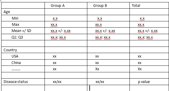 table age*(min max mean stddev ) Country Diseasestatus ,Diseasestatus all ;