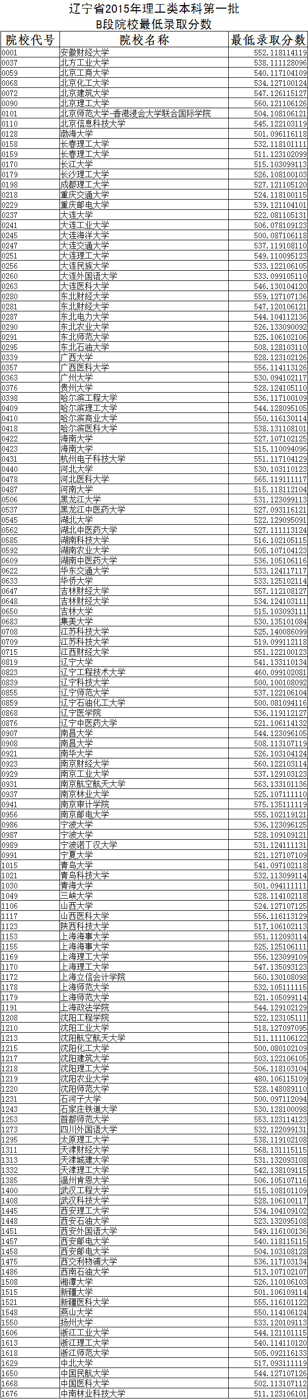 辽宁2015本科第一批B段院校最低录取分数
