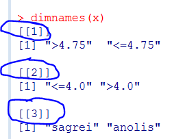 其实我想说刚刚无意中找到问题的解决方法啦,不过我还是将我的问题重新说一下,本来编辑的时候图1,图2是上下两个,可能被广告切开了。就我自己的数据x,输出结果是一楼>x输出的结果,如果>Titanic的话会有带有变量名的,比如Age=child,我希望自己输入>x,能输出kind=sagrei,这个原因也导致我输入>dimnames(x)是输出没有变量名的类别,如图三,而>dimnames(Titanic)的结果是带有变量名的类别,如果输入>str(x)的话,输出的结果是