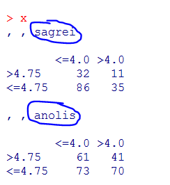 'table' int [1:2, 1:2, 1:2] 73 61 70 41 86 32 35 11