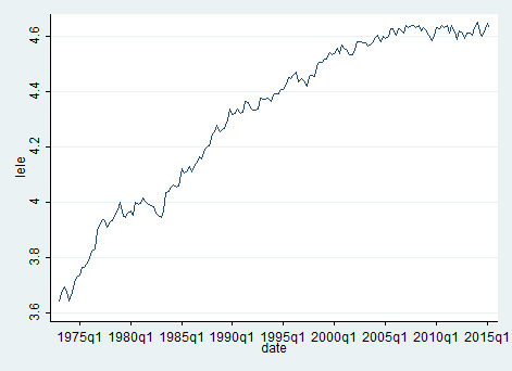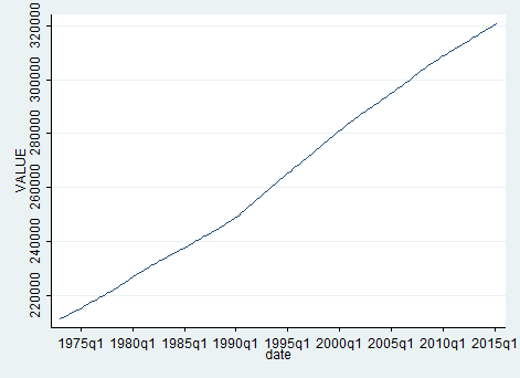 求各位大神帮忙,内容略多请见谅:我有三组数据用ADF分别检验单位根,第一组是季度real GDP:tsline的结果如下,我们老师说这个图像应该是没有消除通胀情况下的gdp但是我下载数据的时候数据源显示是real gdp,请问我究竟是否需要将数据除以cpi呢?另外这个图像似乎显示的是有structural break (抱歉,我在国外读书所以有些专业术语不知道准确的中文翻译), 那么请问我下面的ADF检验是否合理?
