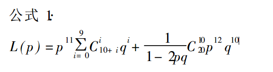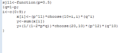 x<-(p^11)*choose(10+i,i)*(q^i)+1/(1-2*p*q)*choose(20,10)*(p^12)*(q^10)