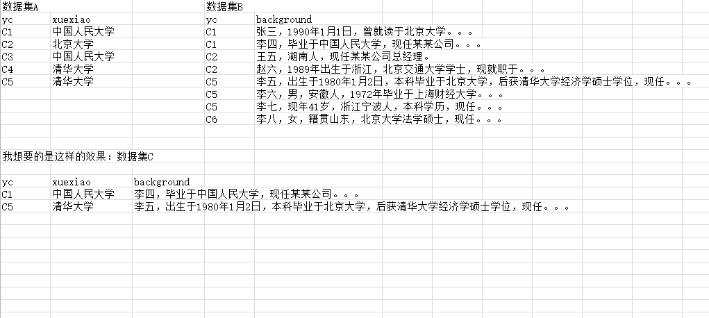 现在需要找出B中yc与A相同时,其background变量项下包含对应的A中的xuexiao字节的观测,然后输出到表C中。